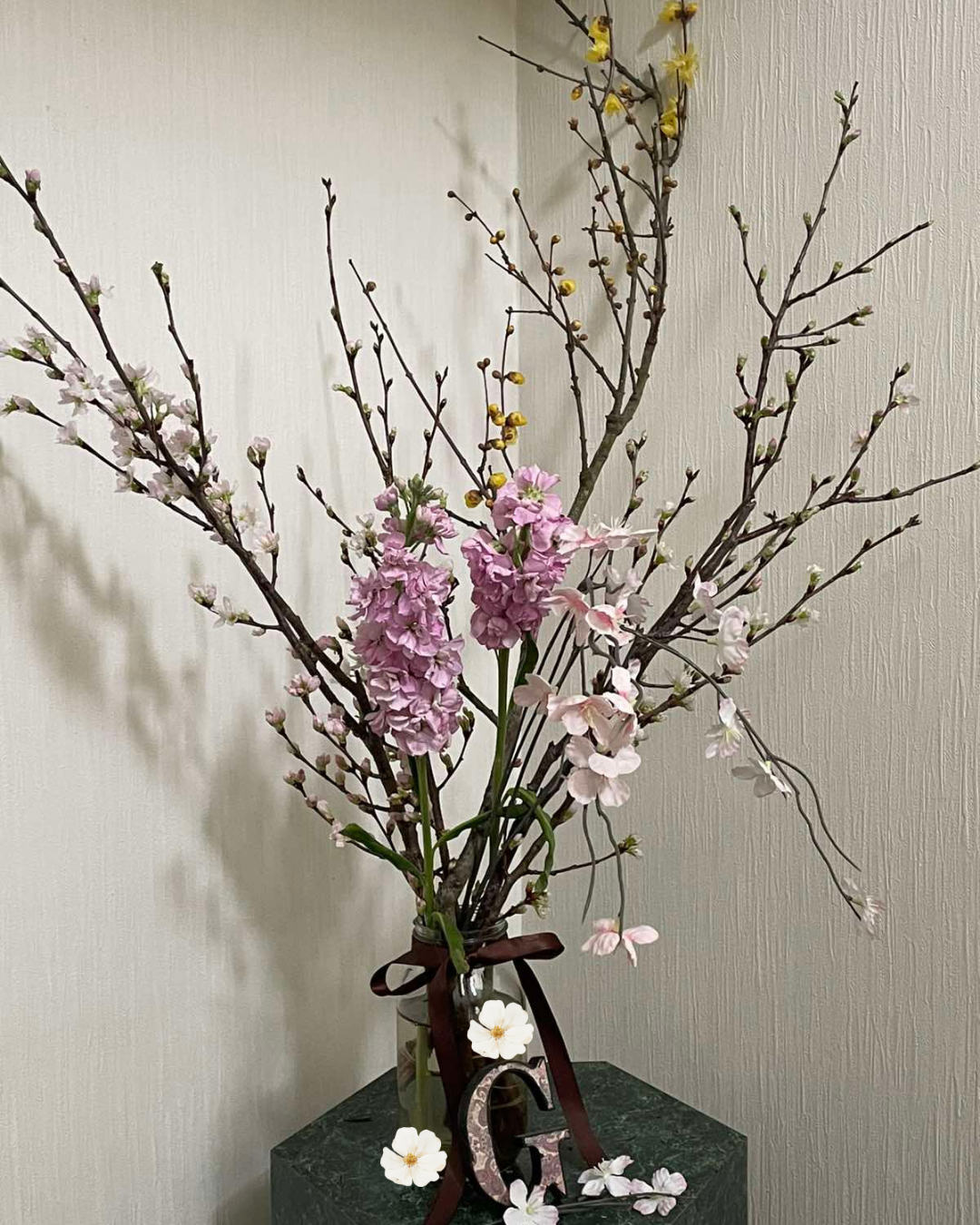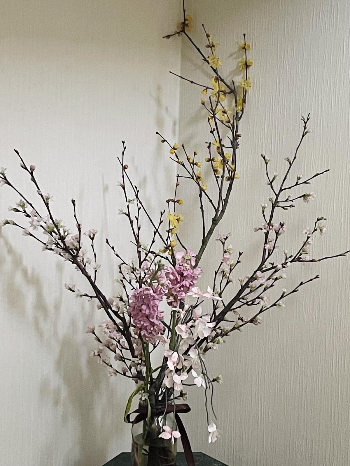 今年は蝋梅・桜・ストックなど冬から春にかけてのお祝いのお花です。